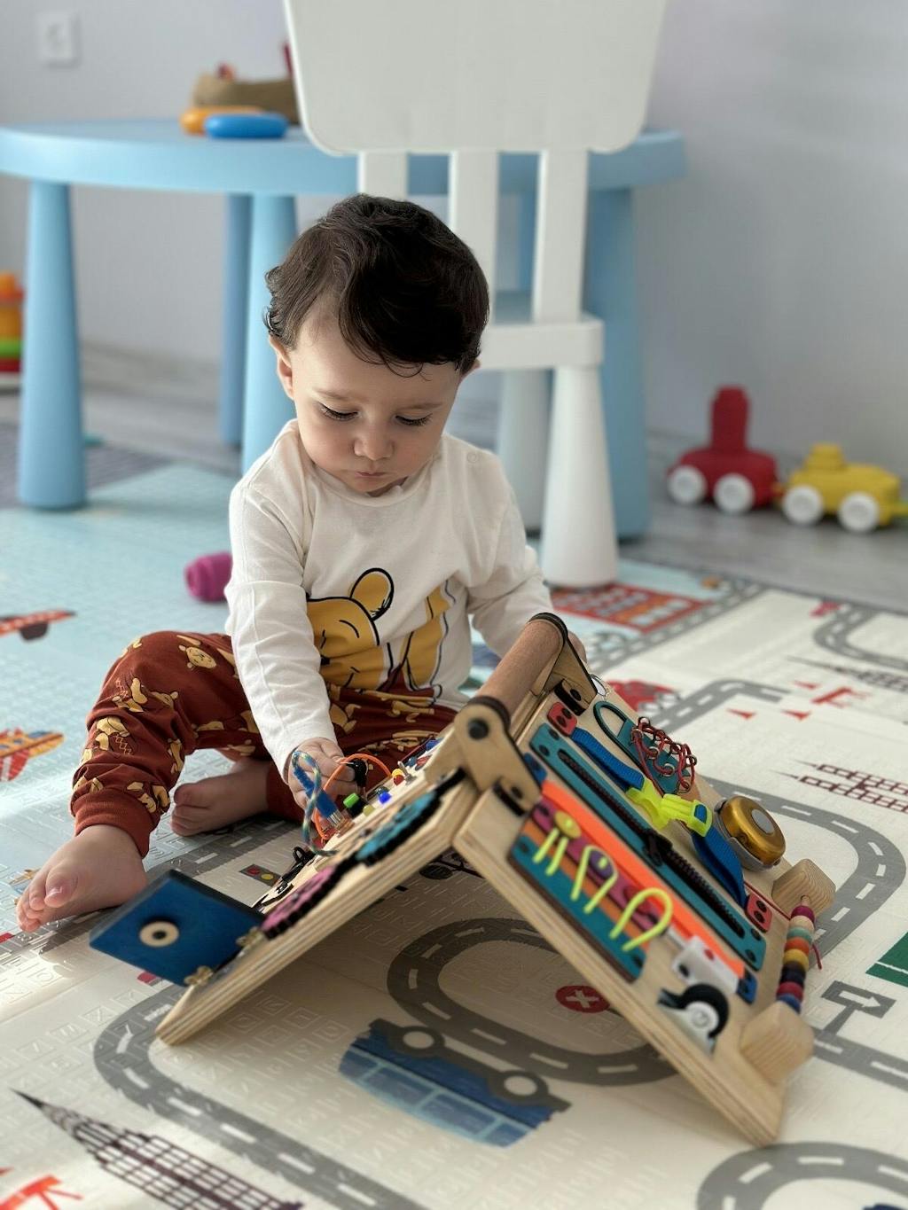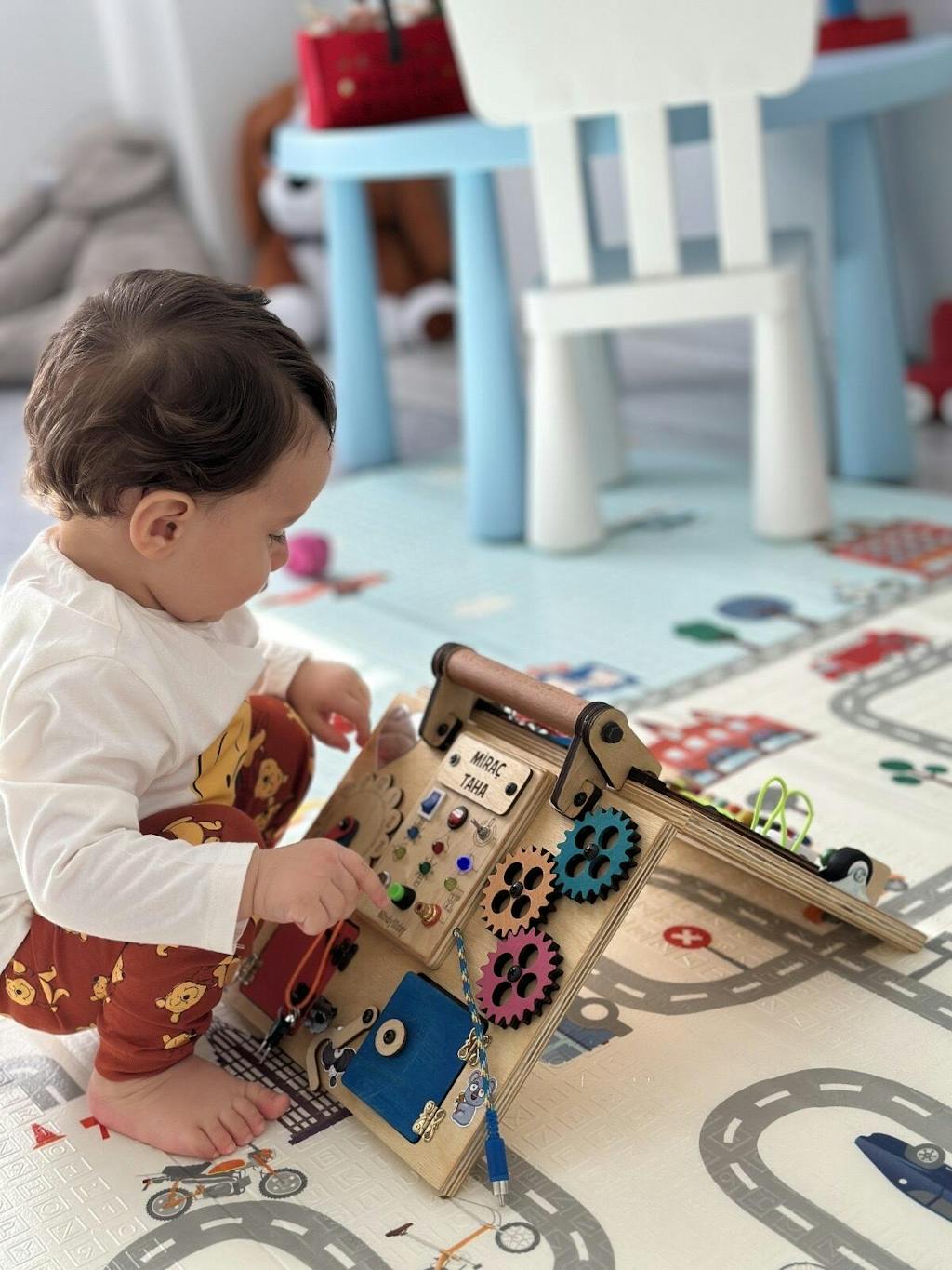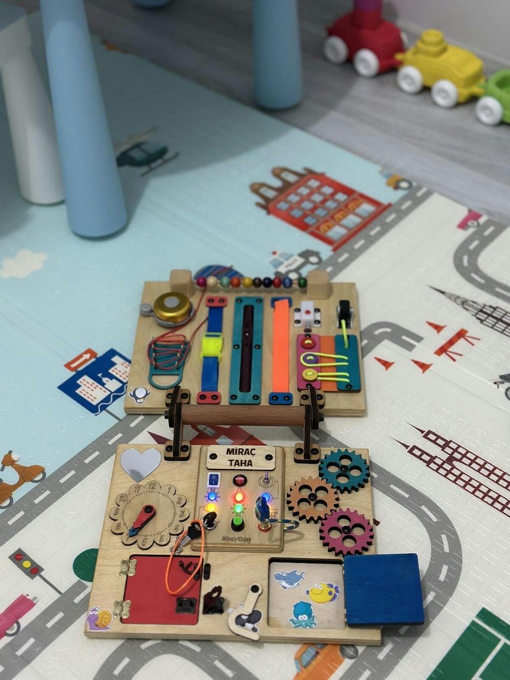 Montessori eğitim yaklaşımından ilham alarak düzenlenmiş bu çok fonksiyonlu pano, özellikleri günlük yaşam yetenekleri oyunla öğrenmesini sağlar.; Ahşap dokusu, canlı renkler ve güvenli tasarımıyla çocukların hem dokunarak hem de görsel olarak duyularını harekete geçirmesini sağlar.